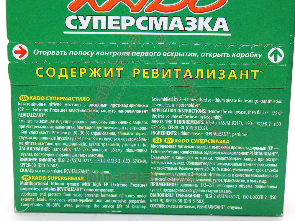 Универсальная смазка с восстанавливающими свойствами ХАДО, в состав которой входит ревитализант, рекомендуема к применению для восстановления и защиты подшипников, узлов и деталей, степень износа которых не превышает 30%. Помимо авто-, мототехники и велосипедов, данное средство также подходит для смазки узлов оборудования строительного, спортивного и бытового назначения.